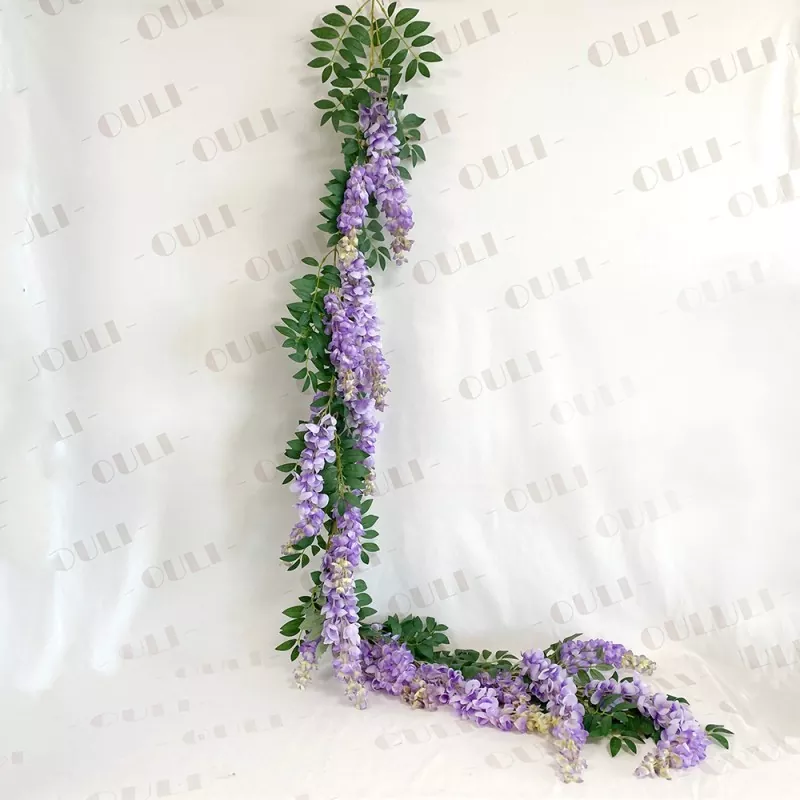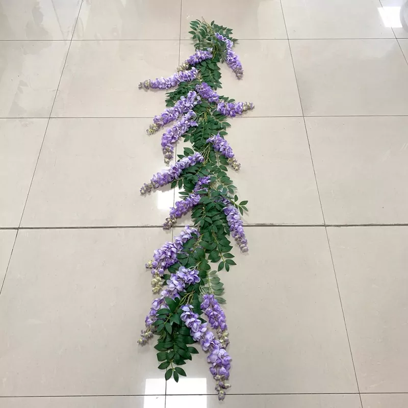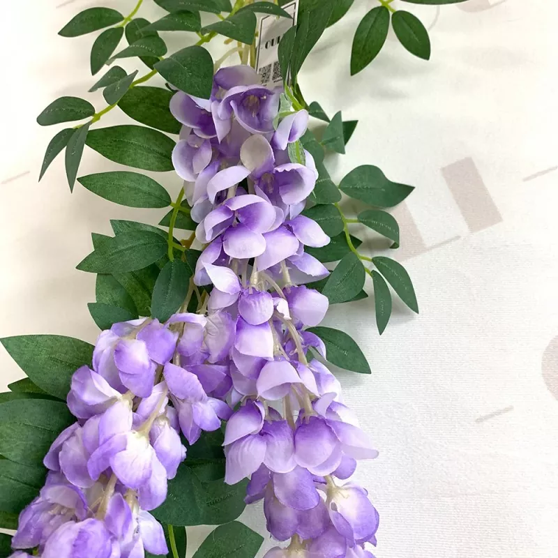 Оваа лажна вистерија долга 2-метарска лажна вистерија е изработена од висококвалитетна свила, пластична и железна жица. Секоја гранка содржи 17 цветни жици на Витеррија и 40-50 зелени лисја. Има природна драперија. И густината на цвеќињата и лисјата е многу добра. Тој е многу погоден за декорација на свадбени лакови, уредување на таванот, вештачки цветен wallид во позадина или комерцијален простор што виси аранжман.