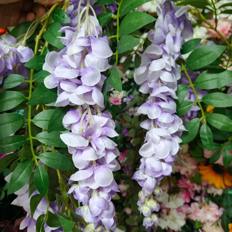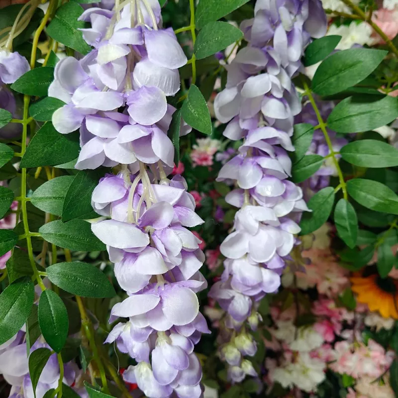 Ова е вештачки wisterид wallид што виси. Секоја гранка е долга околу 200 см и има 17 цветни жици на Вистерија и околу 40-50 лисја.