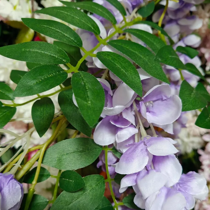 Нашиот внимателно дизајниран лажен wisteria vine wallид виси е богат со боја и животен век во форма на цвет. Можете да изберете најразлични редовни бои или да ги прилагодите ексклузивните бои на Pantone според потребите на клиентите, погодни за свадби и сцени од различни стилови. Структурата е силна и може да се користи постојано без одржување.